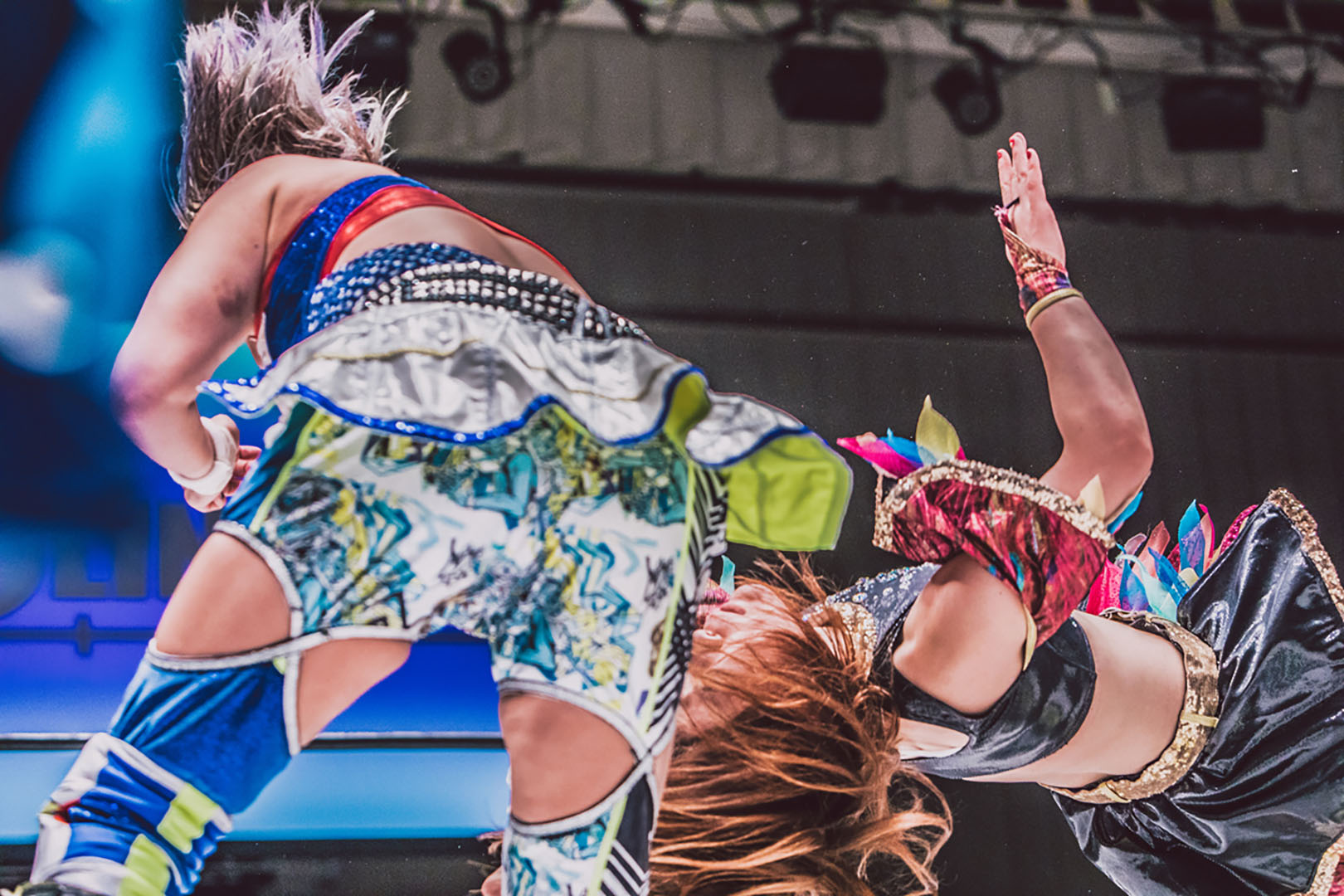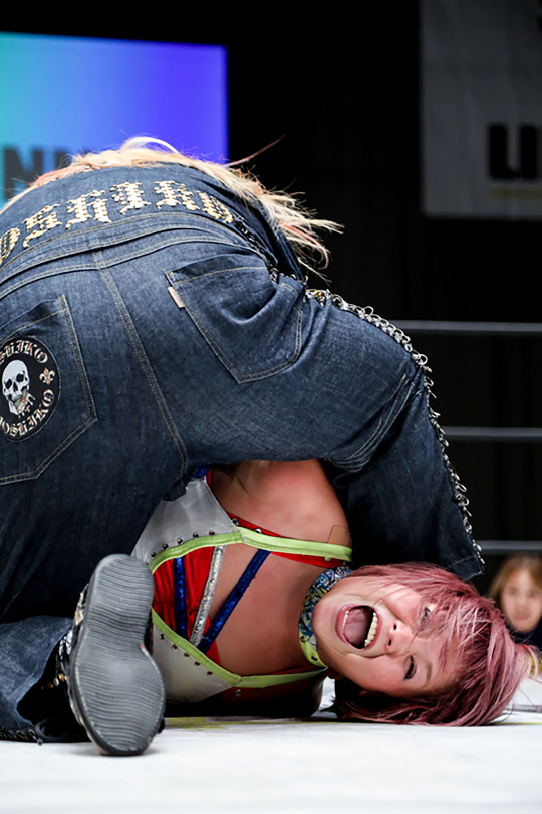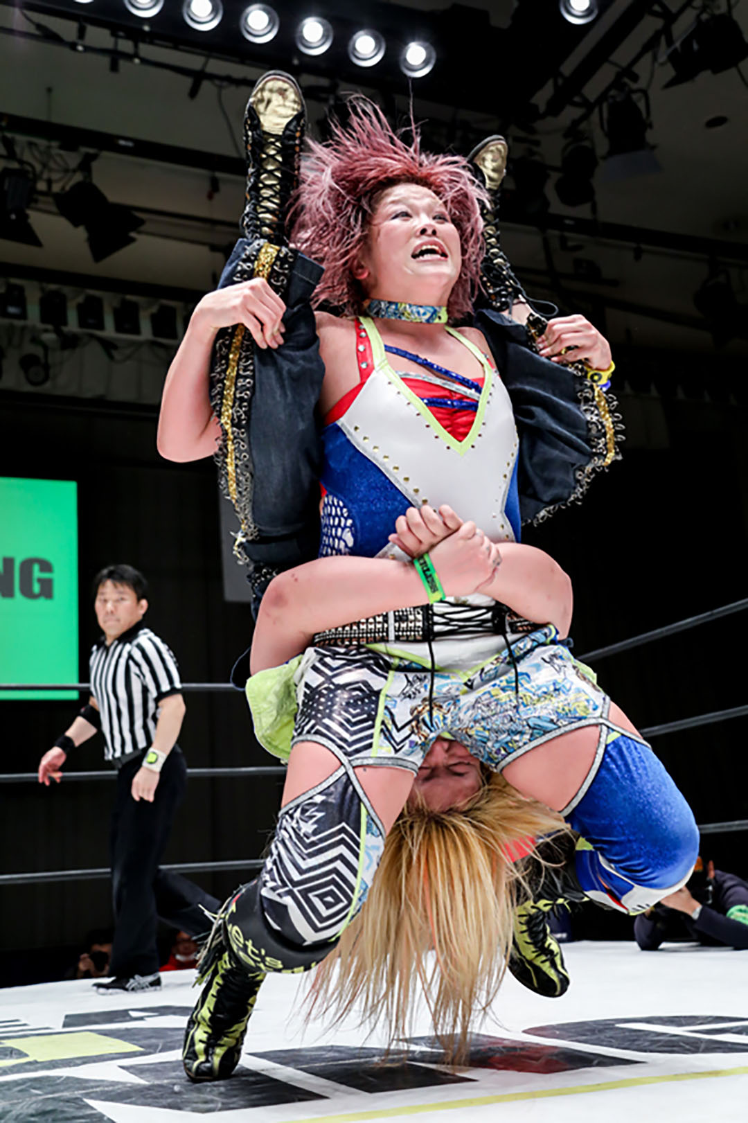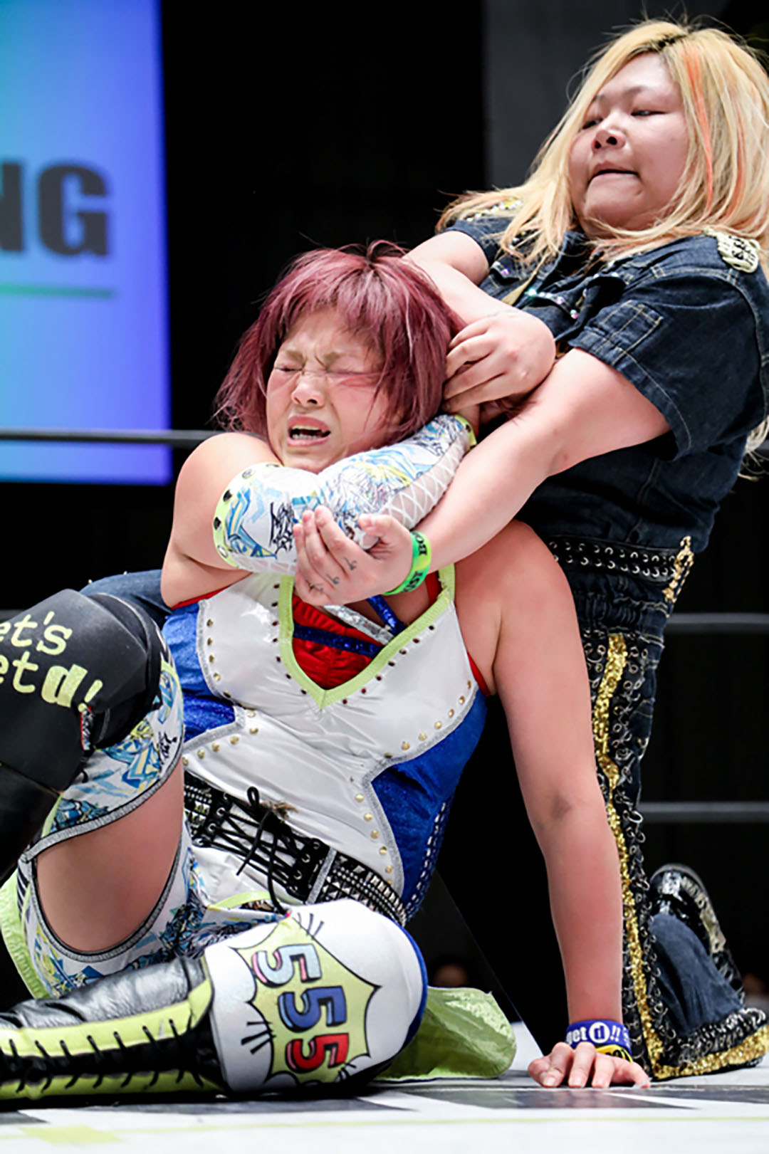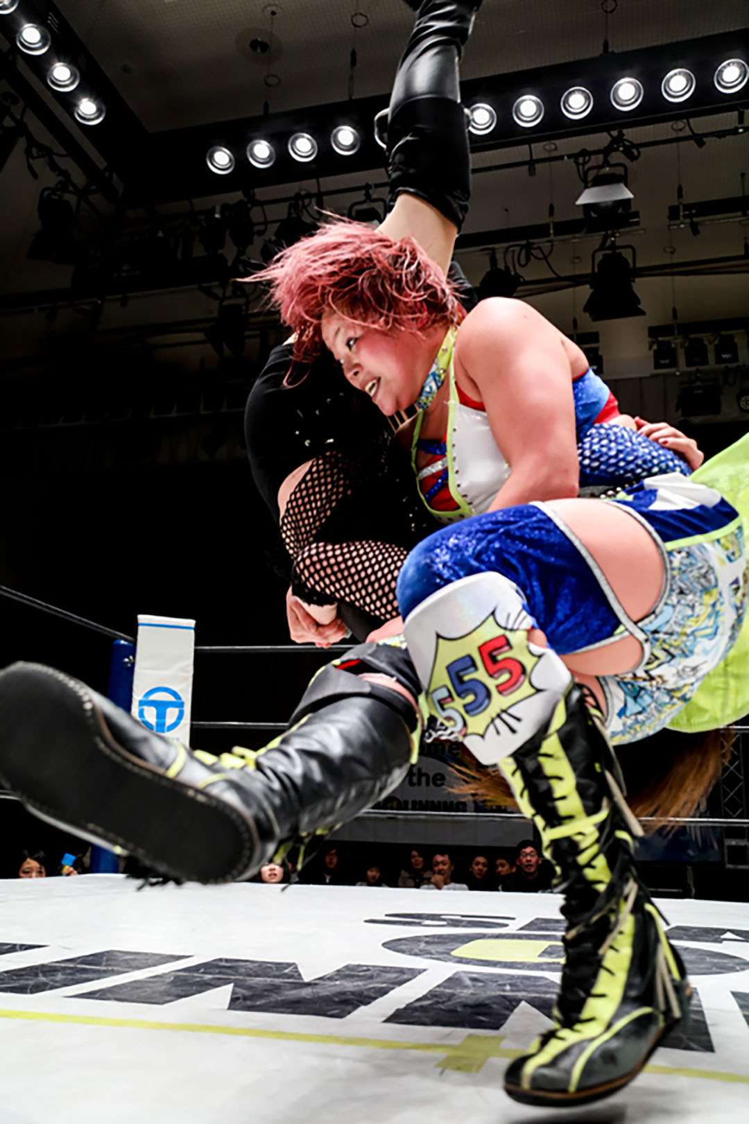 5分経過。奈七永はカウンターでサイドバスターを決めるが、フォールに入られた所で再び朱崇花は腕を固める。串刺しを交わした朱崇花だったが、更にその先を読んでいた奈七永がフットスタンプで叩きつけ、張り手、その場ラリアット、串刺しラリアット、バックドロップ。朱崇花はブファドーラから変型チョークスラムを狙うが、奈七永は膝十字で切り返す。顔面蹴りで脱出した朱崇花だったが、奈七永は投げっぱなしジャーマンからラリアット。エプロンに出た朱崇花に奈七永がインプラント。リングに戻ってバックドロップの体勢から変型ボム。ラリアットを交わした朱崇花が飛びつくも、パワーボムで叩きつけ、クロスエースロック。エスケープされた後、馬乗りエルボー。朱崇花もやり返す。膝立ちでエルボー合戦。