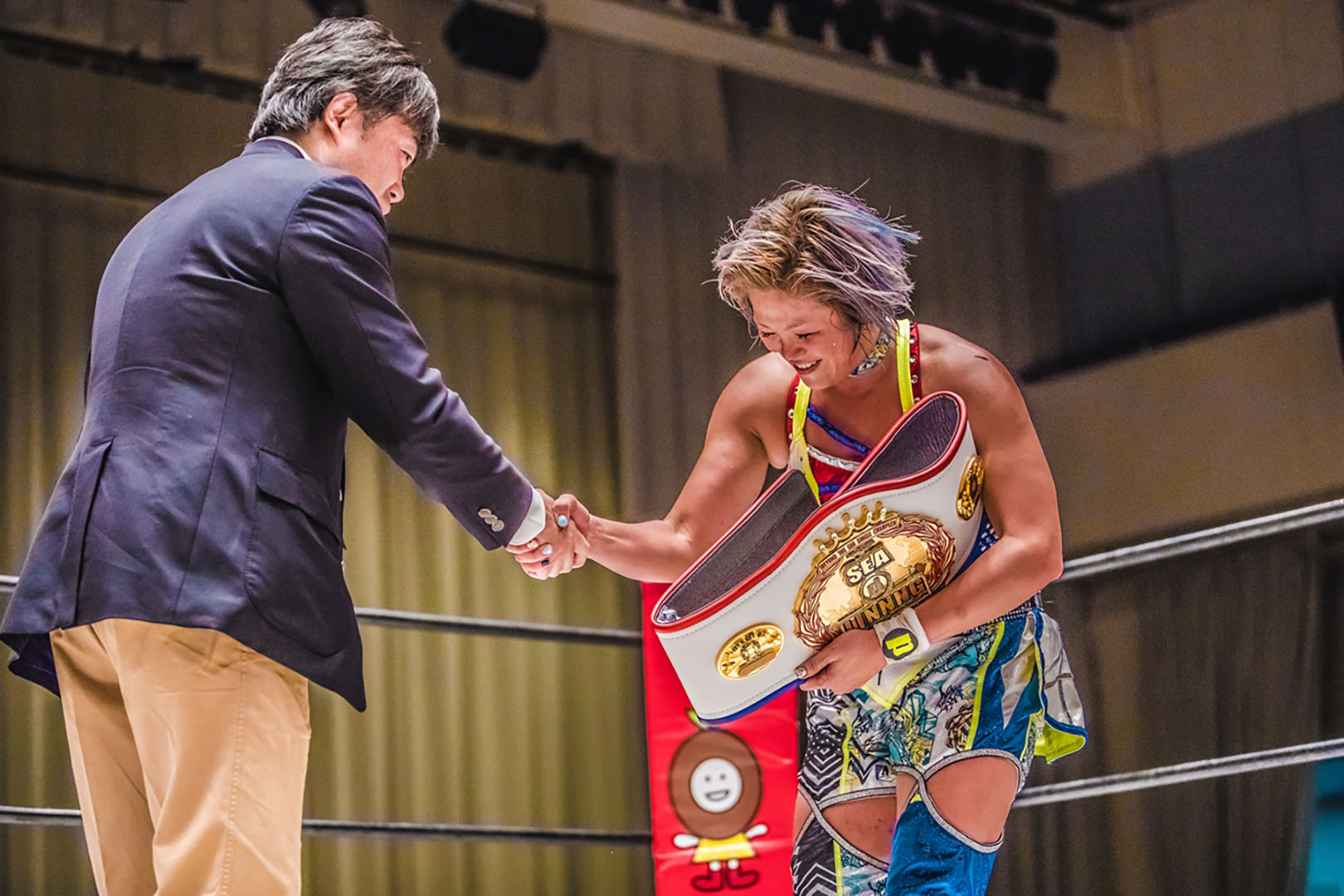 これから、アンタがまっすぐ生きてるのは知ってる。でももっともっと悔しさと向き合え。その為に私は勝ち続ける。これは終わりでも何でも無い。むしろ今日から始まったものでもない。お前とはずっとずっと続いてる。そうだろ。おい、お前が、その顔、涙流してるその顔いいじゃんかよ。それが世志琥だ。それが世志琥そのまんまだ。それをこのリングで曝け出して、もっともっと曝け出した時、お前の元にベルトはいくかもしれない。でも私はもっともっと悔しい思いをさせる為に上に行って勝ち続ける。このベルトを守っていくから。覚えとけ。