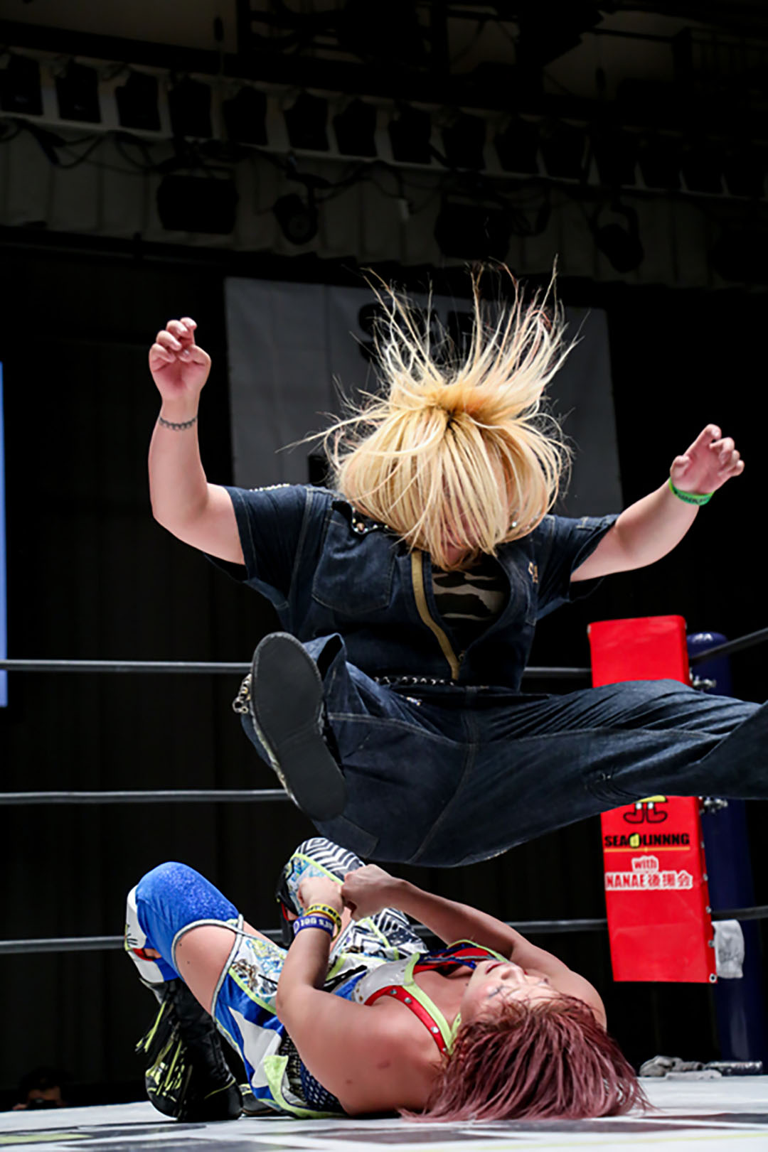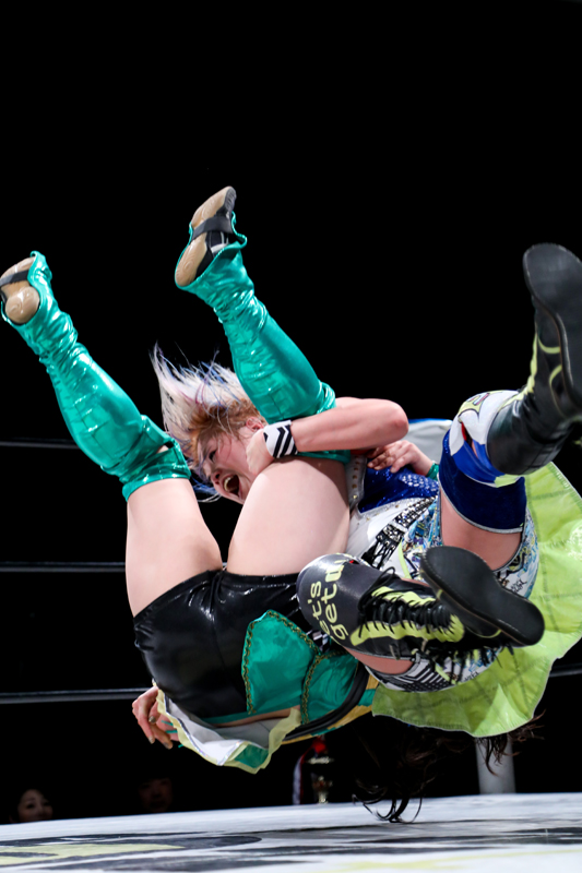 奈七永も変型バックドロップで応戦。裏拳、延髄。世志琥はヘッドバット。奈七永はストレートパンチ。膝をつきながらエルボー合戦。
