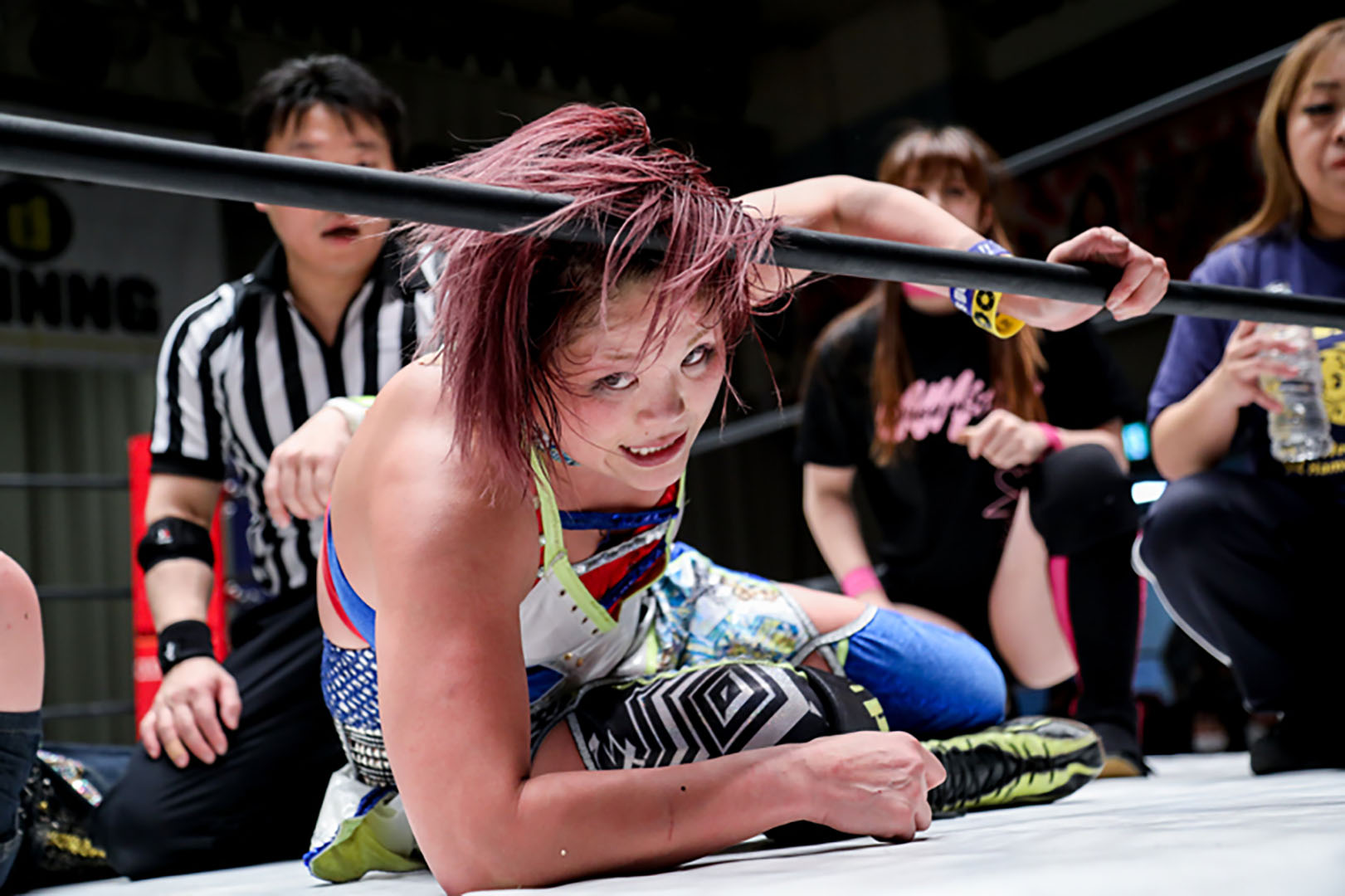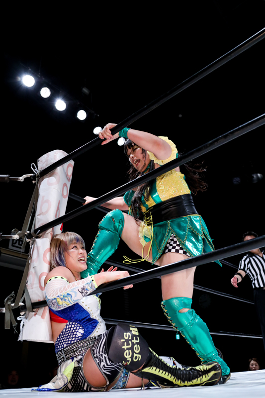 「ヤッホーじゃねえよ、このヤロー」と奈七永が反撃に転じ、「いい加減にしろ」とラリアット、サーフボードストレッチ。エスケープ後もロープに張りつけ。水森は感情むき出しのエルボー連打。一発で返した奈七永がキャメルクラッチ、逆片エビ固め。奈七永は逆水平も連発。串刺しをよけた水森はタックルからエルボー連打。ラリアットも避けてタックル。抱えようとする水森だが、奈七永が叩きつけて絞り上げる。水森は突っ込んできた奈七永をショルダースルーで場外に転落させる。