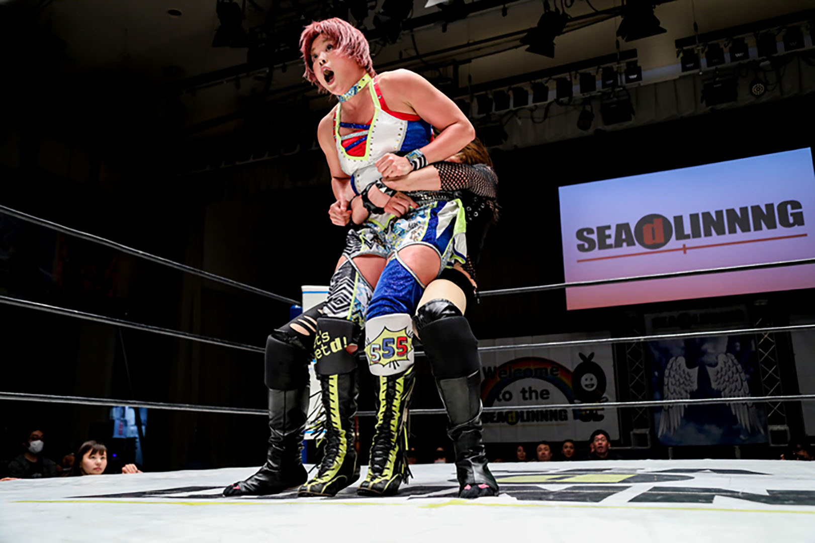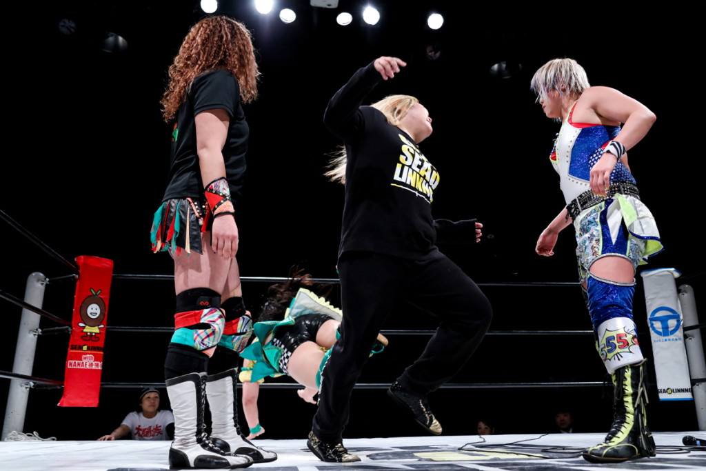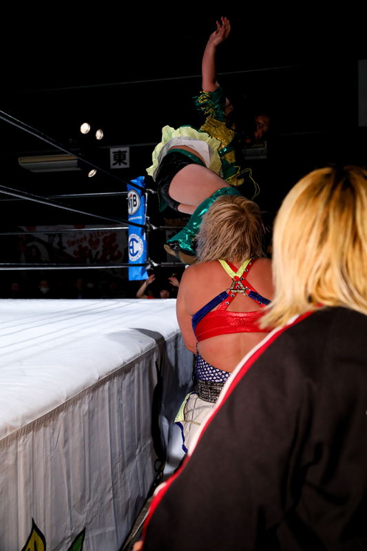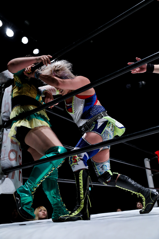 その頑張りに安里紗コールが自然発生。奈七永ももう一度、ワンセコンドEXを狙う。なんとか回避した中島がケンカキック。ドラゴンSHでカウント2。ムーンサルトプレスを放つが、これもカウント2止まり。