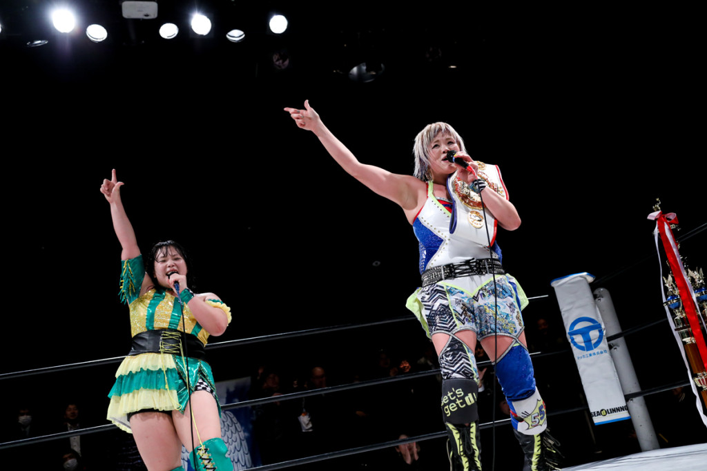 奈七永 ああ。ちょっと私も口が上手くないので言葉でやりとりするよりもやっぱりプロレスで、試合でやるのが一番だと思うので、じゃあお前には一つ借りもあるから、3月20日、後楽園で防衛戦、組みます。お前、何年目だよ。