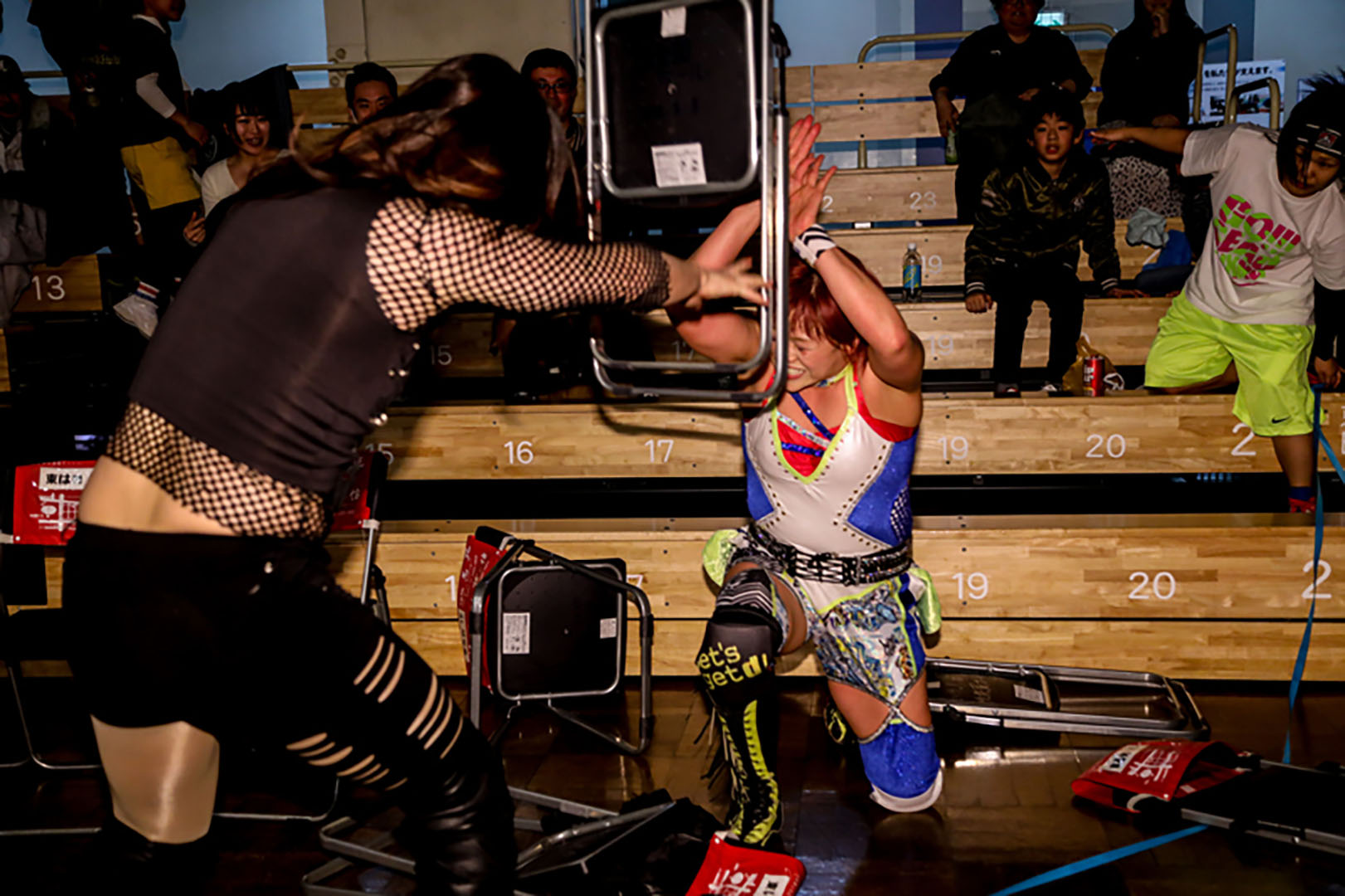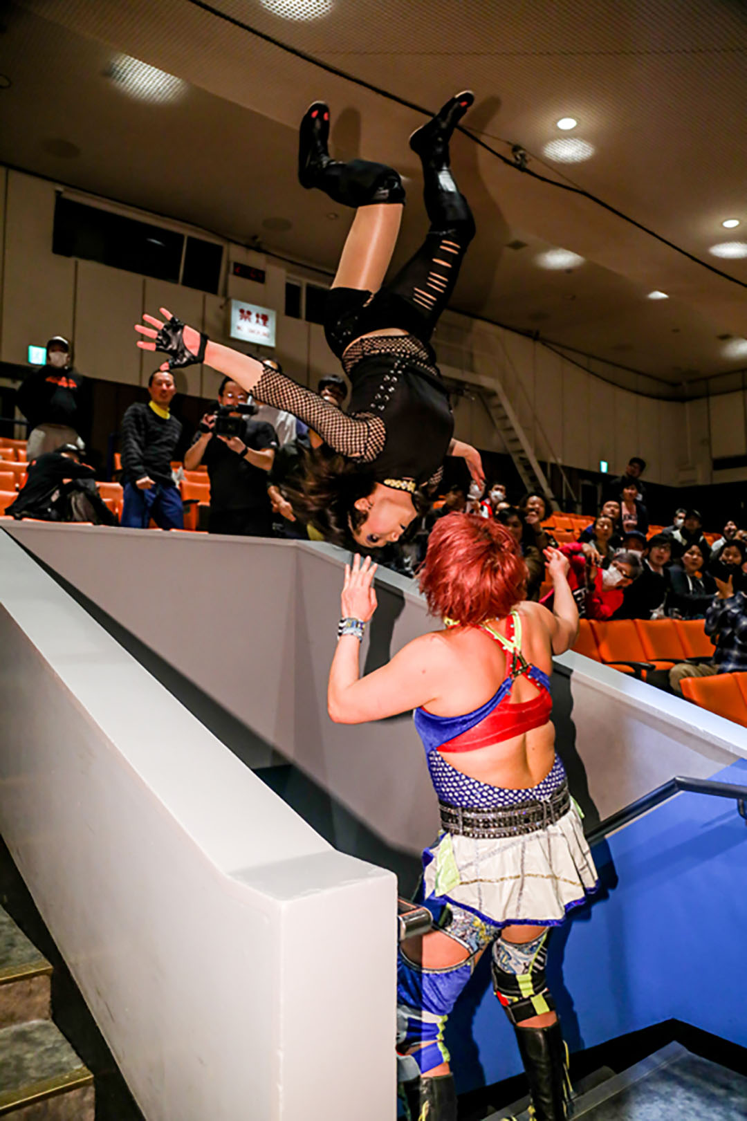 奈七永がコーナーでアピールしている所を襲撃した朱崇花。ムーンサルトアタックをかわした奈七永がトペを狙うが、朱崇花はイスで迎撃し、場外乱闘。朱崇花が優勢。南側の階段の上からムーンサルトアタック。顔面へのイス攻撃を決め、ミサイルキック2連発。奈七永はタックル。朱崇花はカウンターでイス攻撃。スペースローリングエルボーを迎撃した奈七永はぶん投げる。だが朱崇花は変型腕十字。